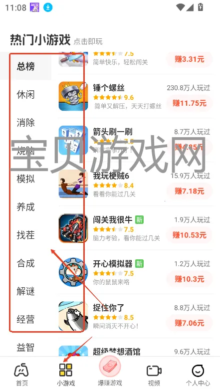 3、或者进入小游戏板块,可以筛选类型,获取喜欢的游戏内容