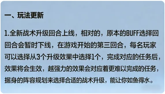 1、战术升级回合是本赛季替代了传统buff选择回合的全新机制,在游戏开局的第三回合,系统会为你提供三个不同的升级效果选项。